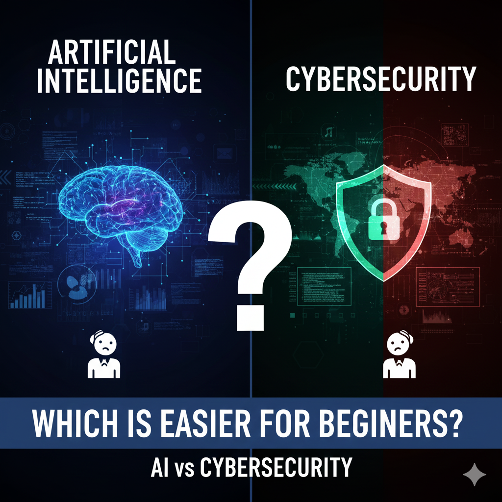 Being new, then to have a less hectic, more organized learning experience, with higher-incremental milestones, and more practical experience, then cyber-security is the less difficult path to begin. While the time to learn mathematics and love messing with data-based models is worthwhile, AI serves as a reward In the future, although its entry barrier is more difficult at the start.